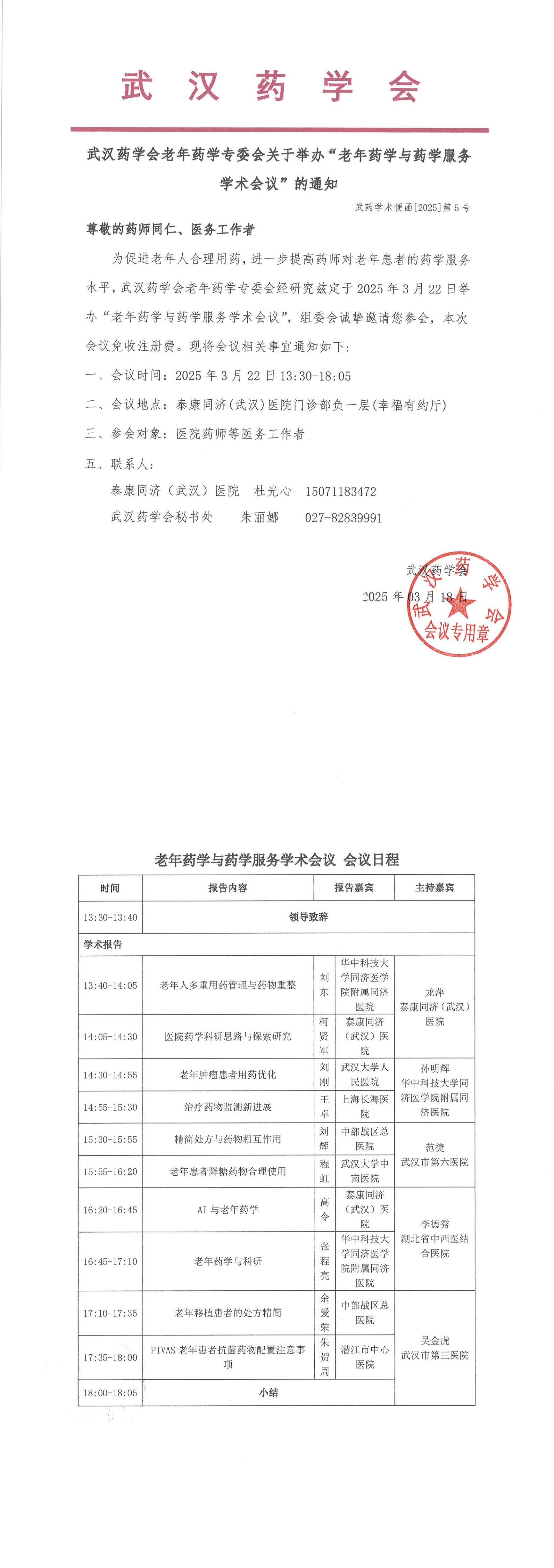 武汉药学会老年药学专委会关于举办“老年药学与药学服务学术会议”的通知