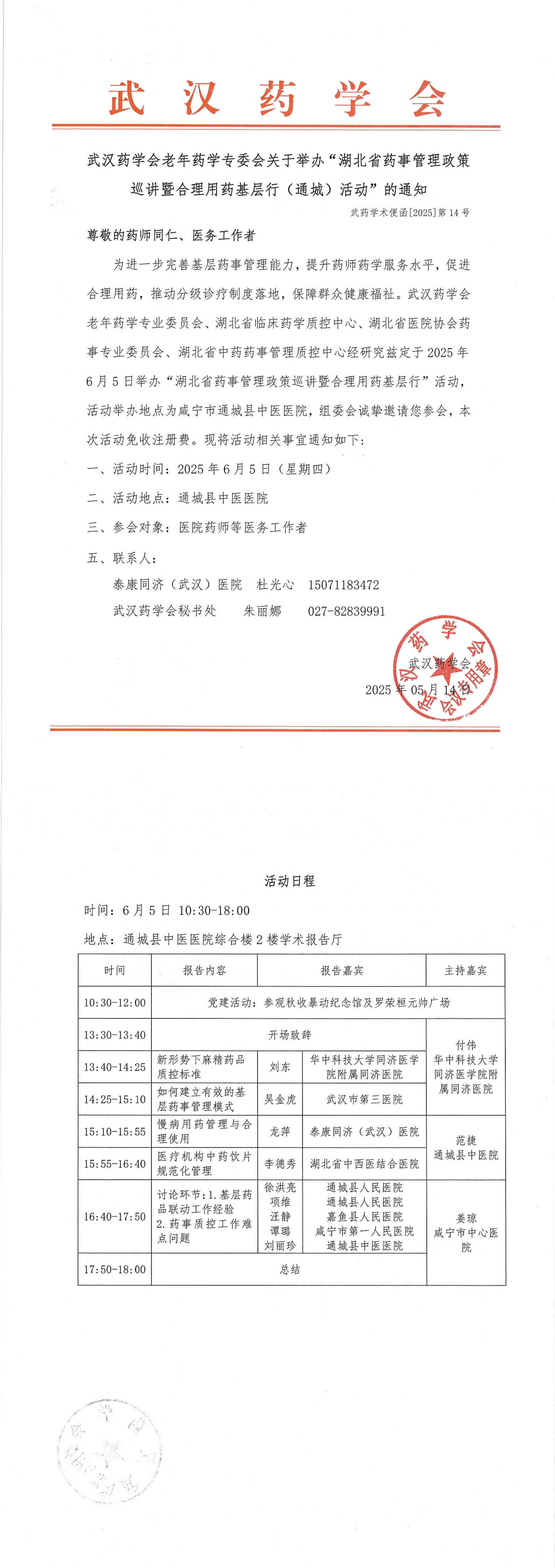 武汉药学会老年药学专委会关于举办“湖北省药事管理政策巡讲暨合理用药基层行(通城)活动”的通知