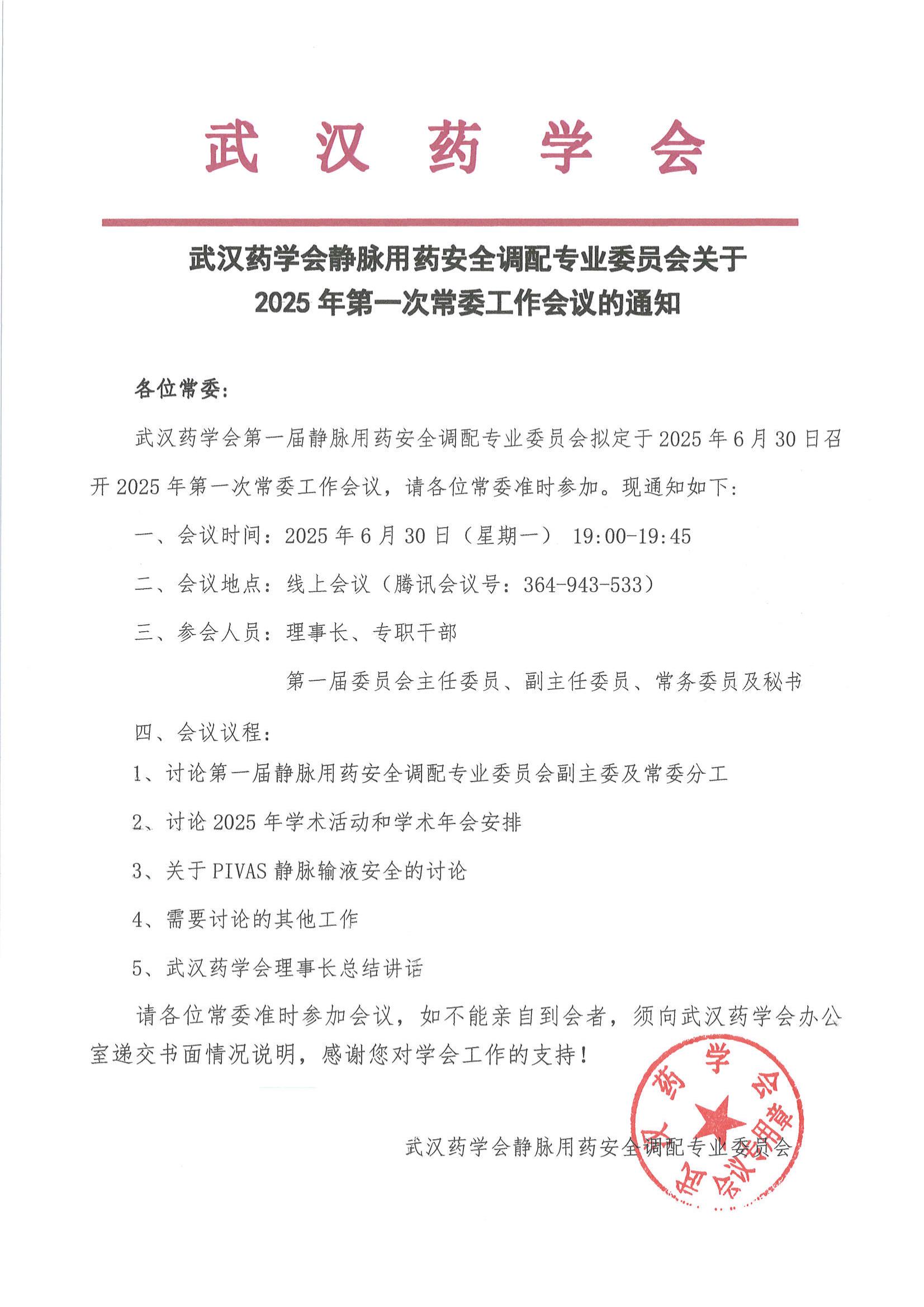 武汉药学会静脉用药安全调配专业委员会关于2025年第一次常委工作会议的通知