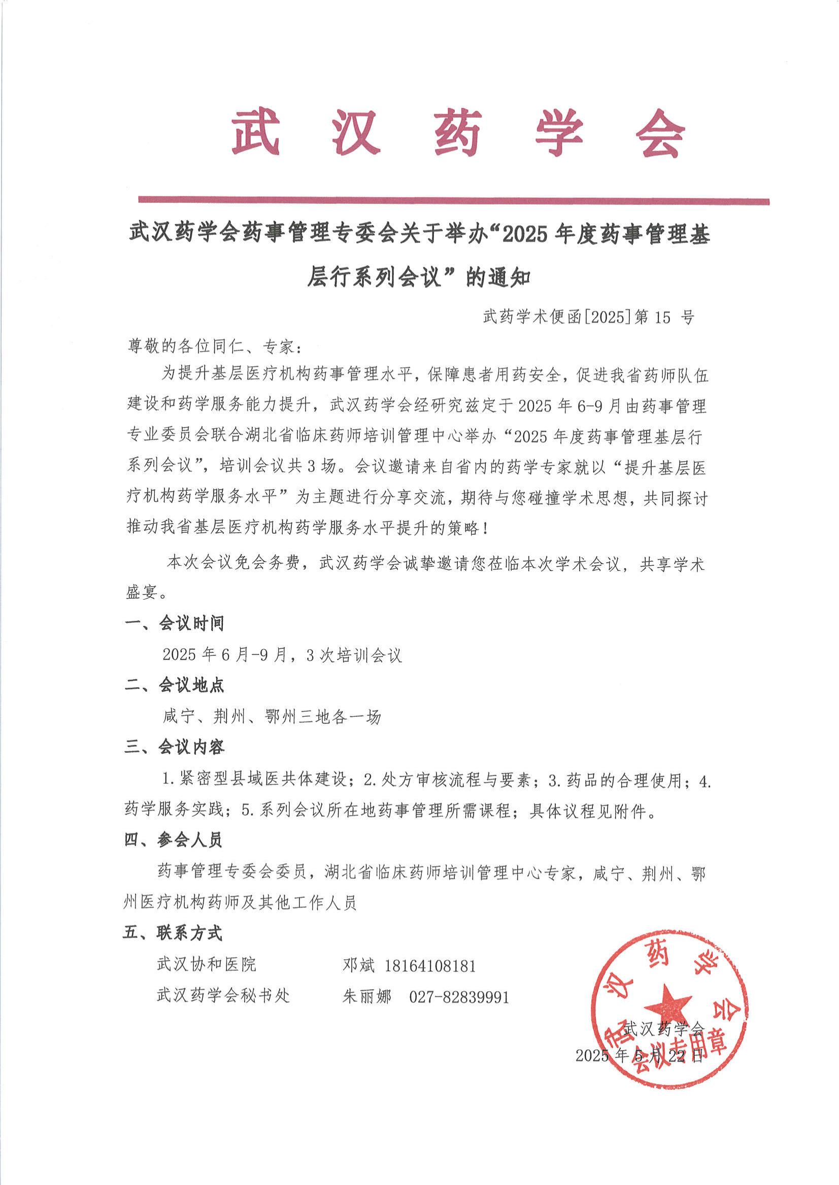 武汉药学会药事管理专委会关于举办“2025年度药事管理基层行系列会议”的通知