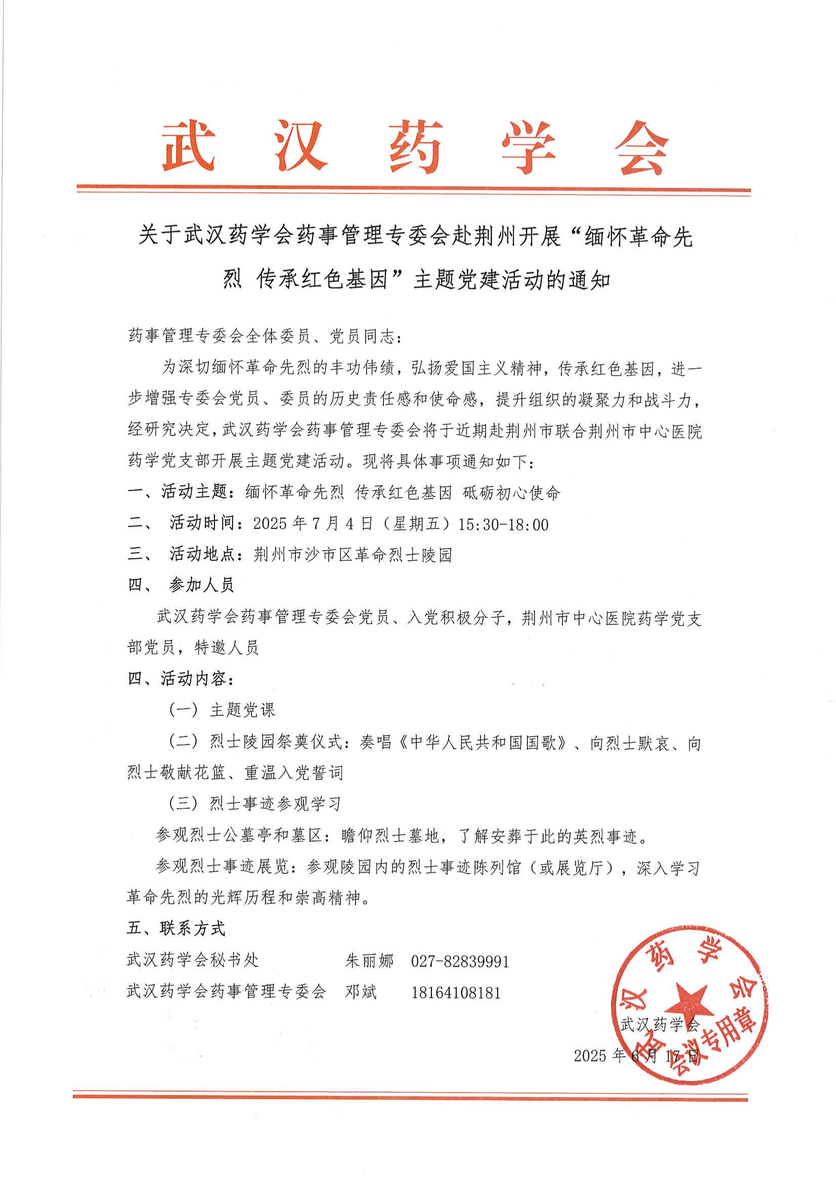 关于武汉药学会药事管理专委会赴荆州开展“缅怀革命先烈传承红色基因”主题党建活动的通知