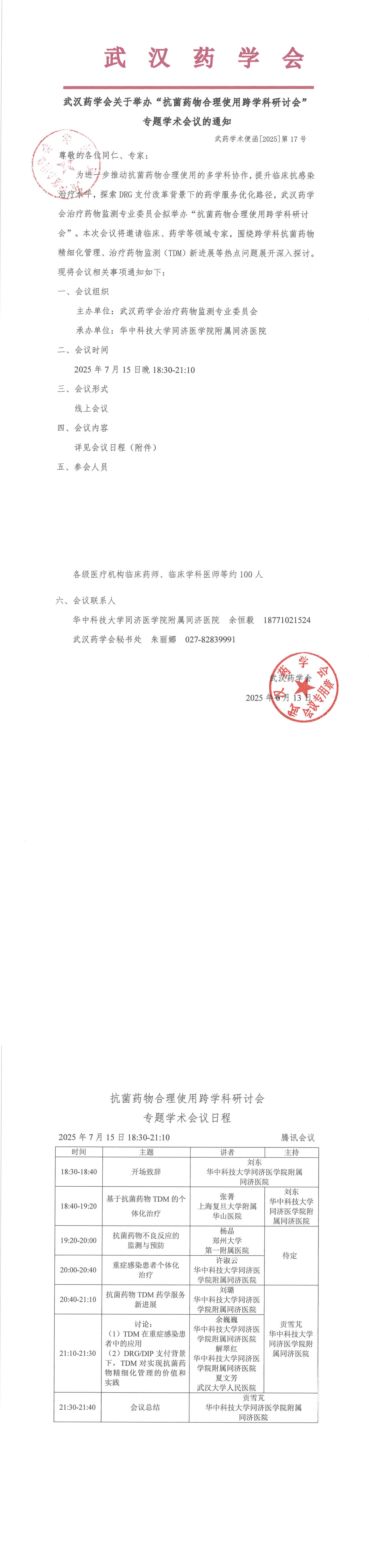 武汉药学会关于举办“抗菌药物合理使用跨学科研讨会”专题学术会议的通知
