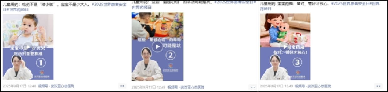 9月17日亚心总医院视频号集中发布3条儿童安全用药主题科普视频,内容聚焦家长关注的核心用药问题,形式简洁直观、重点突出,具体内容如下:《儿童用药:吃药不是“缩小版”,宝宝不是小大人》:明确界定儿童用药与成人用药的本质差异,强调不可随意缩减成人药物剂量给儿童服用,避免因用药剂量不当引发不良反应;《儿童用药:这些“爱娃心切”的举动可能是坑》:系统梳理家长在儿童用药中的常见误区,如盲目使用抗生素、过量服用退烧药、擅自调整用药疗程等,引导家长树立科学用药观念;《儿童用药:宝宝药箱:备对、管好才放心》:详细列举儿童家庭药箱的必备药品清单(如儿童专用退烧药、外伤处理药品、益生菌制剂等),并明确药品储存管理要求,助力家长规范管理家庭药箱。上述三条视频均添加#2025世界患者安全日##世界药师日#话题标签,借助平台算法推荐机制,快速触达目标受众(家长群体),有效提升科普内容传播效果。