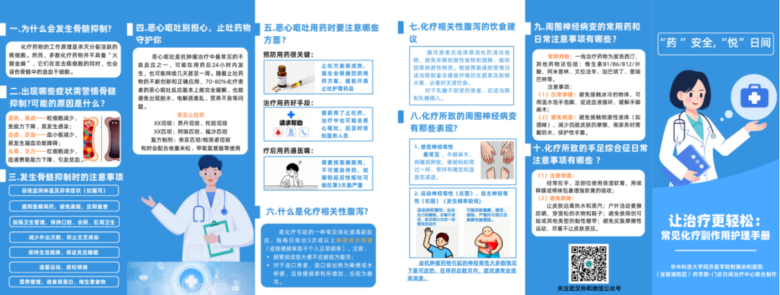 武汉协和医院药学部联合门诊日间治疗中心于9月17日下午在金银湖院区举办了以《“药”安全,“悦”日间》为主题的科普交流分享会。会上,药学部主管药师滕爽与门诊日间治疗中心主管护师辛萍分别进行了《知己知彼:提前了解与应对化学治疗的身体变化》和《安全用药,安心治疗——日间治疗知多少》专题分享,另外科普团队提前凝练了讲座中的关键知识点,制作成了以《让治疗更轻松:常见化疗副作用护理手册》为主题的科普折页,并于现场发放给参与的患者及家属,以便随时查阅。最后患者和家属们积极互动,针对化疗副作用管理、日常注意事项、化疗期间的情绪管理等关切问题与药护团队进行深入交流。