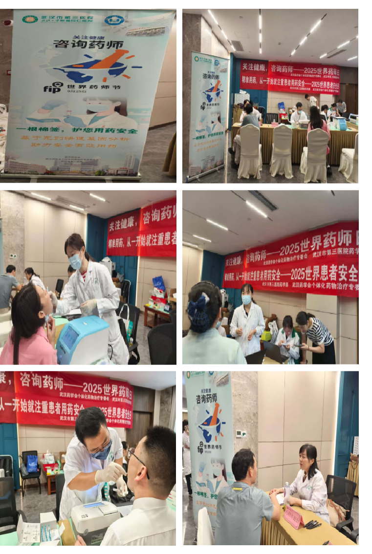 武汉市第三医院药学部联合武汉药学会个体化药物治疗专委会组织临床药师团队于2025年9月19日上午在紫阳湖宾馆开展了以“精准用药,从一开始就注重患者用药安全”为主题的特色义诊活动。临床药师现场为80余人进行了酒精、氯吡格雷、阿司匹林、高血压用药相关的基因检测,并对报告进行解读。本次活动以临床药师主导+快速基因技术支持的组合创新模式,形象化揭示基因差异对酒精、药物代谢的差异性,显著提升了公众对于个体化用药的认知,使科学健康的用药理念深入人心,有效建立起风险预防的第一道关卡。