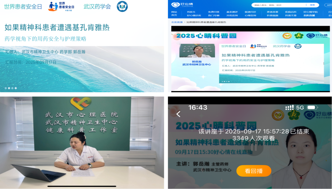 武汉市精神卫生中心药学部于2025年9月17日世界患者安全日当天,在好心情互联网医院平台举办了一场以“精神科患者遭遇基孔肯雅热:药学视角下的用药安全与护理策略”为主题的药学科普直播活动。本次直播由药学部主管药师郭岳瀚主讲,聚焦精神科患者在感染基孔肯雅热期间的用药安全问题,从疾病的识别、急性期用药原则、药物相互作用、精细化护理等多角度进行了系统、专业的讲解。内容紧密结合临床实际,突出药学服务在保障患者用药安全中的关键作用,并用通俗易懂的顺口溜进行全篇总结。整场直播在线观看人数达3349人,展现了公众对合理用药知识的高度关注与需求。