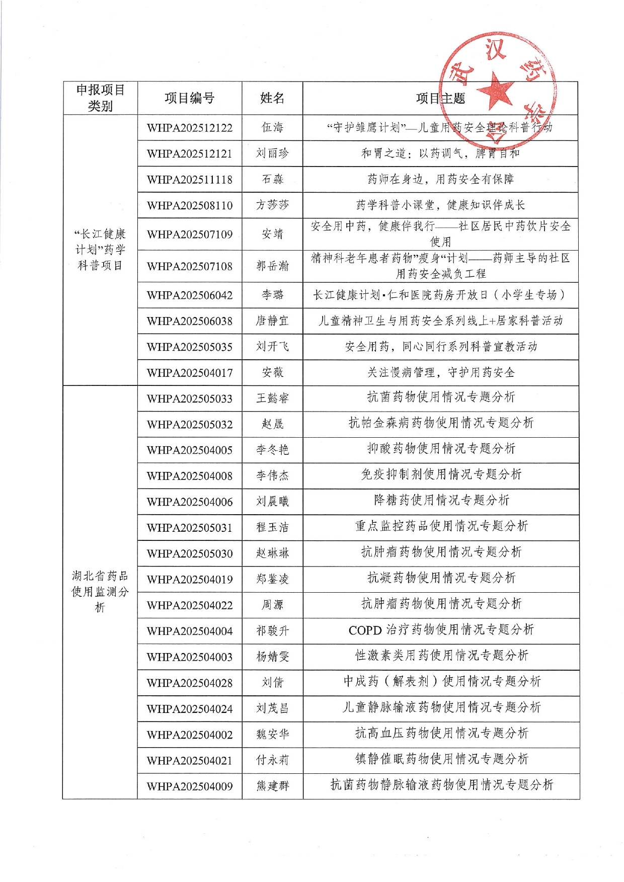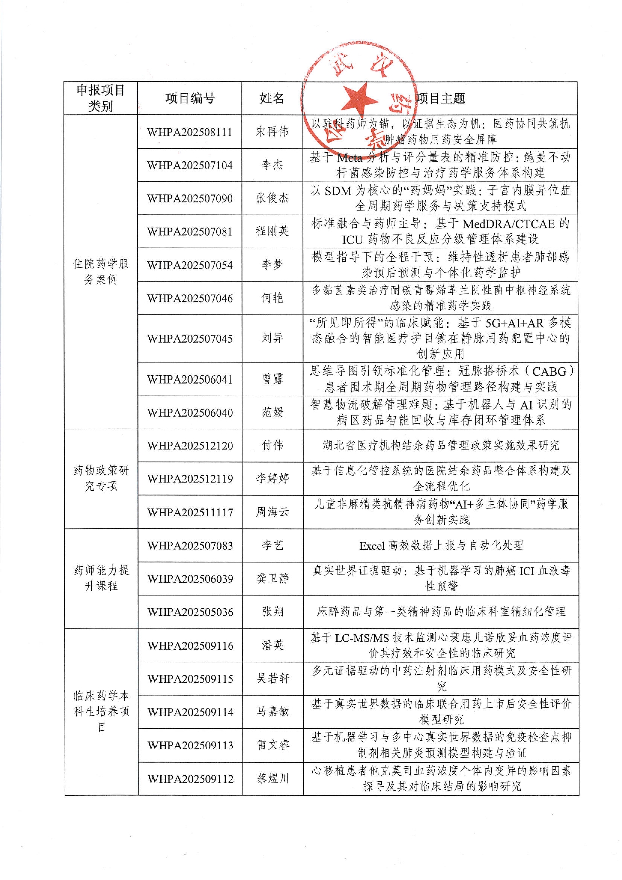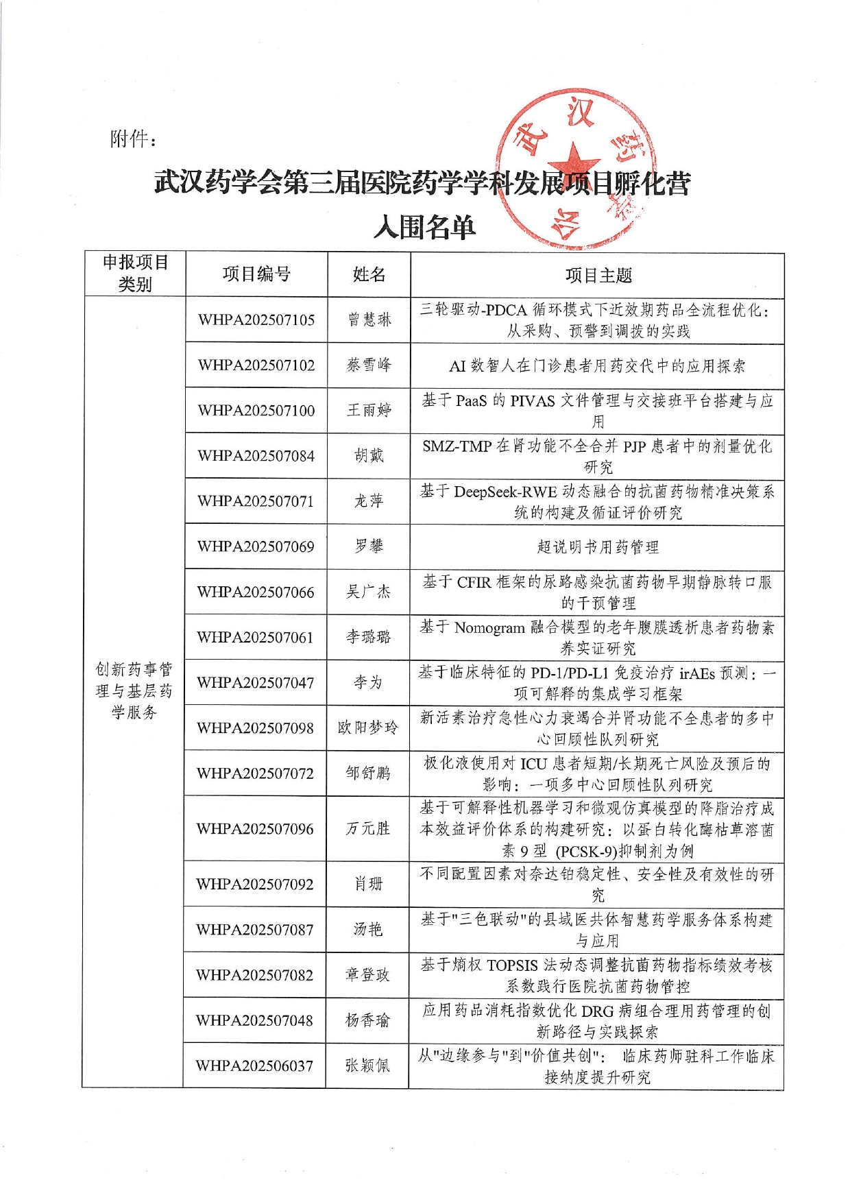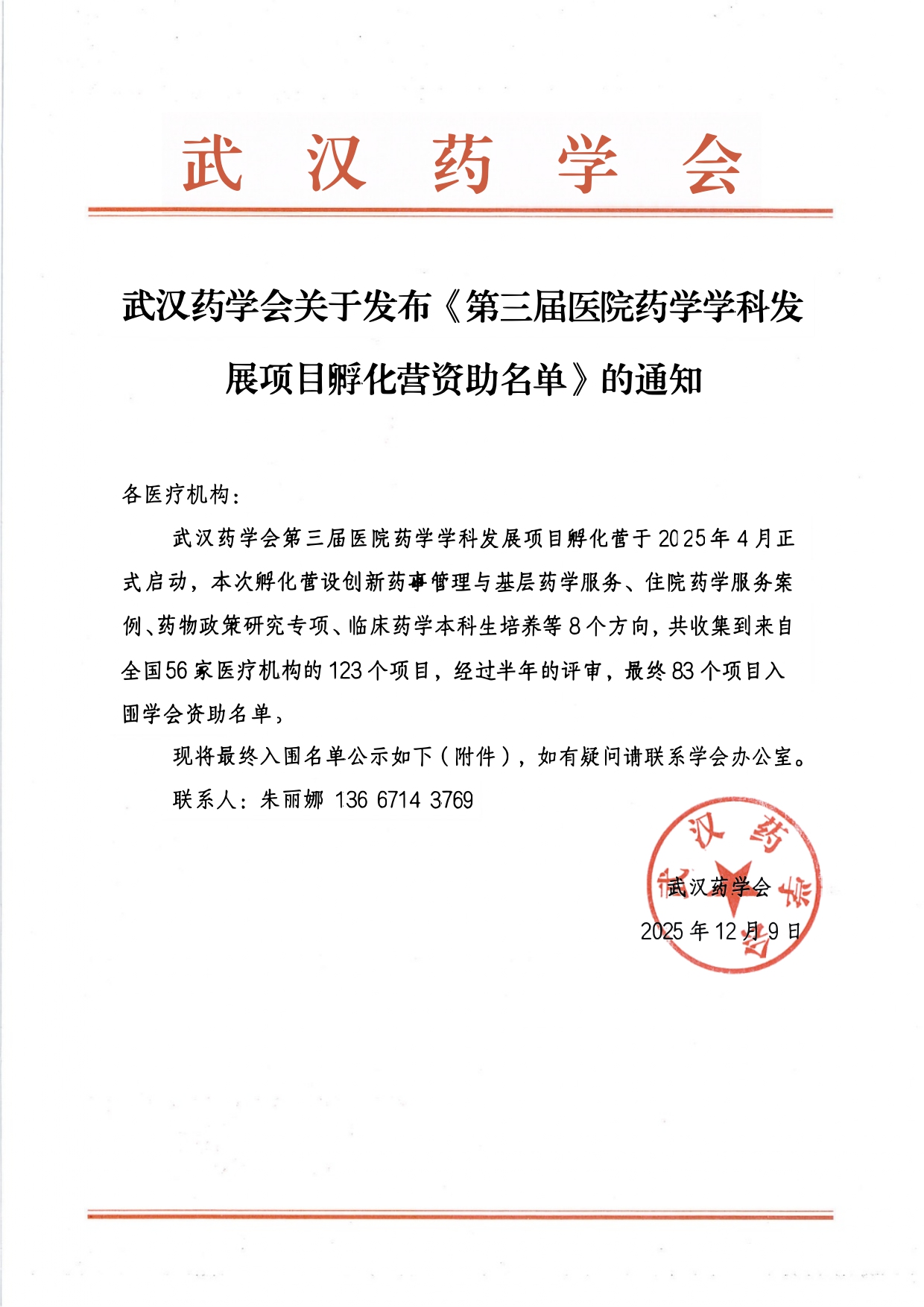 武汉药学会关于发布《第三届医院药学学科发展项目孵化营资助名单》的通知